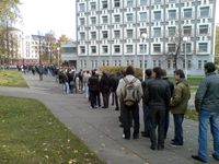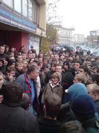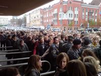 Где-то за 15 минут до начала продаж в окошке кассы вывесили объявление: "БИЛЕТ НЕТ" (видимо подразумевая "билетов нет и 16.10.2008 не будет"). Очередь распалась мгновенно: вот стояли, а вот все и сразу пошли вперед. Сотни страждущих оказались у касс (в том самом несчастном окошке уже успели разбить стекло) и осознавали новость.