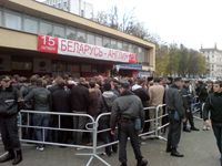 Следующие 3-4 часа прошли не так уж тягостно. Отструктурированная с помощь спецназа толпа развлекалась как могла: пускали волну как на стадионе, пели "Вперед Борисов" - причем как полагается по борисовским правилам: сначала восточная часть толпы, потом западная. Пили пиво, запасливые - чай из термосов. Рассказывали новости из Борисова, в котором билеты поступили как и полагается в 11.00. Звонили знакомым (больше рук - больше билетов). Посмеивались над отстоявшими в очереди с 5-7 утра, а оказавшимися в хвосте (стоя в 15 метрах от заветных окошек смяться легко). Было весело, и главное понятно, что или билеты будут, или членам турагентства "АБФФ-путешествие" не жить.