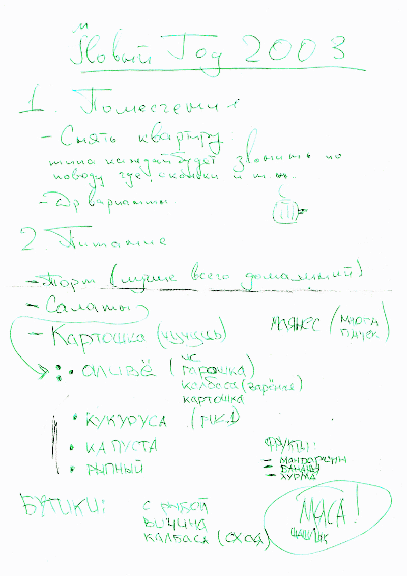 Выскажу свое мнение: шпроты и т.п.(паштет и другие производные) сразу нет. Олино предложение сделать бутики к красной рыбой (семгой или форелью) полностью поддерживаю. Мясо на шашлык - да (можно взять и свинину и ножки куриные, но надо, что бы мало не было), рыба в этом качестве меня абсолютно не прельщает, но если большинство хочет - то плиз. Сразу оговорюсь, что мы (я и Андрюха) будем до утра 1-го и все, так что два дня это не совсем про нас. Про салаты меня сразу вычеркивайте, я в их готовке почти 0, максимум что-нить из риса с кукурузой и краб. палочками, но это не для НГ. Да и вообще с готовкой будут проблемы, поскольку 29,30 и 31-ое рабочие дни. Так что может все же подумать о большем количестве закупок. Картошка на горячий гарнир, вполне гуд. Из домашних заготовок могу взять банку помидоров с огурцами (мариновоных), банку компота какого-нить, какой-нить закатанный салат (ну типа из зел. помидоров и т.п.), может еще чего. Фруктов надо много, особенно мандаринчиков. Надо отдельно оговорить спиртное. Возможно целесообразно, чтобы каждый купил то, что он будет пить. Если несколько челов будут пить одно и то же, то могут объединиться. Сладкое однозначно должно быть. И я все-таки склоняюсь к торту, ну и конфеты какие-нить (приличные) в качестве приятного дополнения. А вообще конечно надо бы собраться ;)