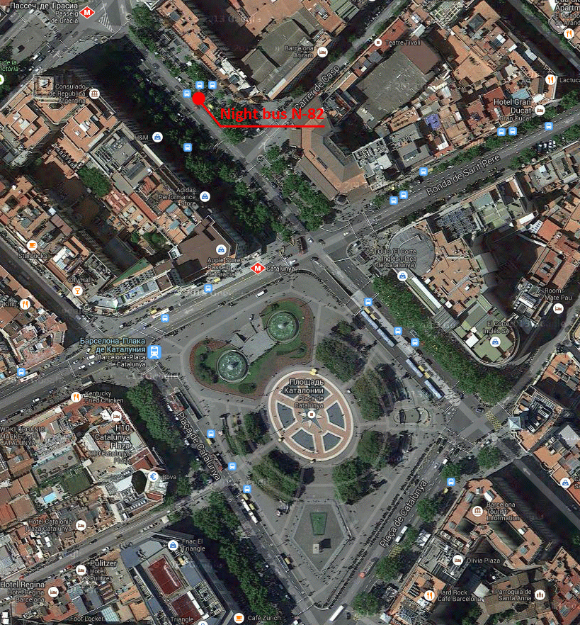 Схема остановки ночного атобуса N82. Баселона, площадь Каталонии