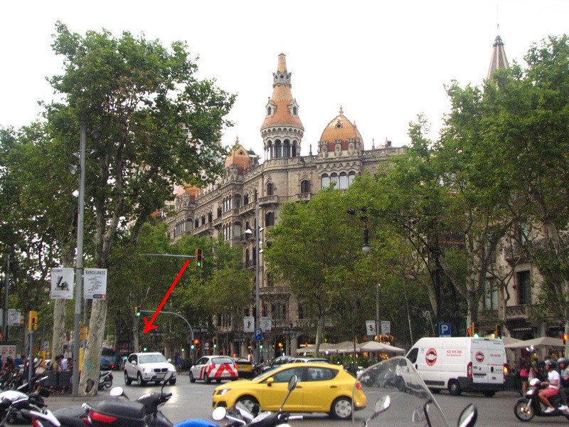 Остановка находится не на самой площади Каталонии, а на прилегающей улице Passeig de Gracia. Находится она на север от площади.